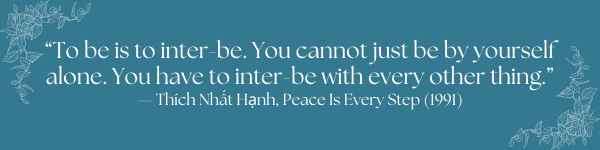 Have you noticed how easy it is, even with the best intentions, to slip into thinking of “the world” as something outside of yourself — the fires are somewhere else, the floods are somewhere else, the suffering is somewhere else. But when you step outside and feel the weight of the air after a long, hot summer, or flight of a hummingbird over the flowers, or the soft, dark Earth beneath your feet, remember: this is all one system. Your well-being is not separate from the well-being of the world that holds you. Take a moment to mindfully acknowledge your interdependence with the world, offering appreciation.You might consider doing this with a simple exercise. I was once asked during a meal at a silent retreat to think about all that made the salad possible (pick your own food). It was an amazing discovery for me, I hope it will be for you as well.
