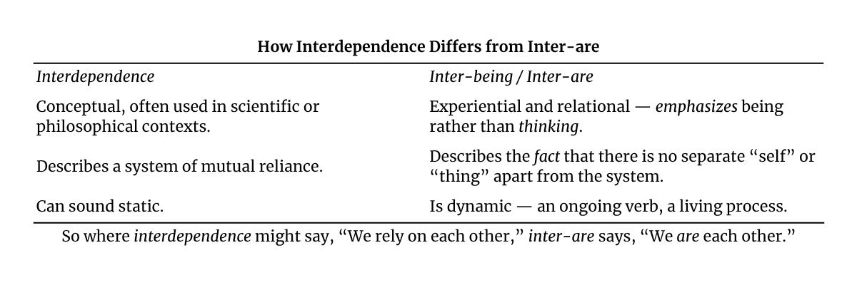 In a world increasingly fractured by politics, polarization, and ecological strain, Universal Responsibility isn’t just an ethical idea; it’s a survival skill. It asks that we widen our circle of concern to include everyone, the forests that give us breath, the oceans that regulate our weather, and the generations who will inherit what we leave behind. To act for “all living kind” is to remember that we “inter-are.” The term “inter-are” originates from Thích Nhất Hạnh’s teaching of interbeing — his poetic expression of interdependence as a lived reality. He coined the term “inter-are” (a verb he invented) to help English speakers feel the dynamic, ongoing nature of connectedness, something more alive than the abstract noun “interdependence.” (See the table below to review the distinction.) “Inter-are” means that nothing exists independently. Everything co-arises in relationship with everything else. Nothing exists in isolation. Not a person, not a thought, not a nation. As Thích Nhất Hạnh would say: every political, personal, and ecological choice ripples outward through the same web of life.
